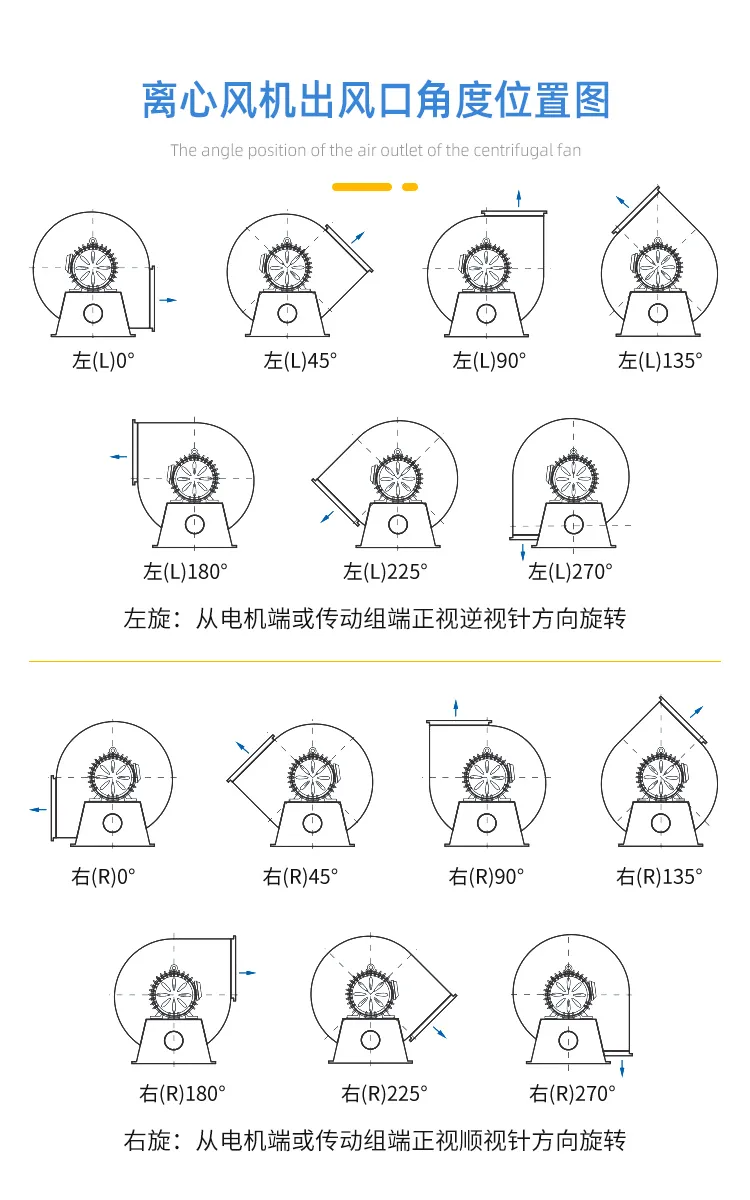 左右,指的是葉輪的旋轉方向;幾度,指的是風機出口的位置。
