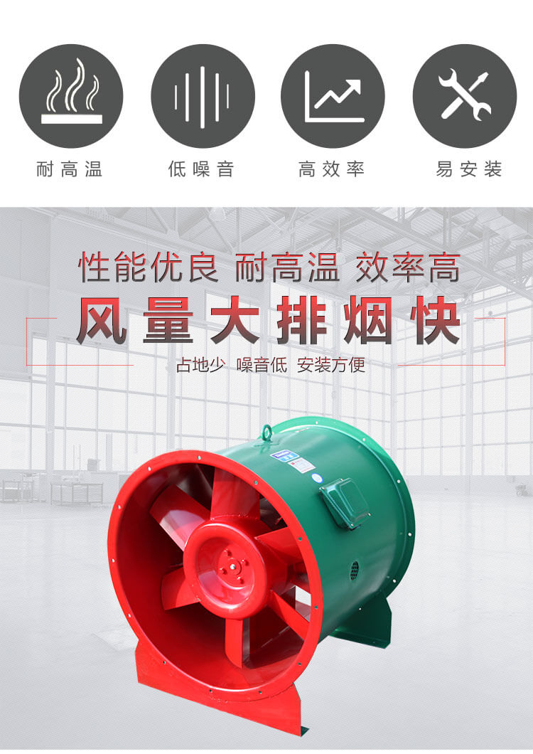 6、HTF消防排煙風(fēng)機(jī)有性能優(yōu)良,耐高溫性能良好、效率高、占地比離心風(fēng)機(jī)少、安裝方便等特點。