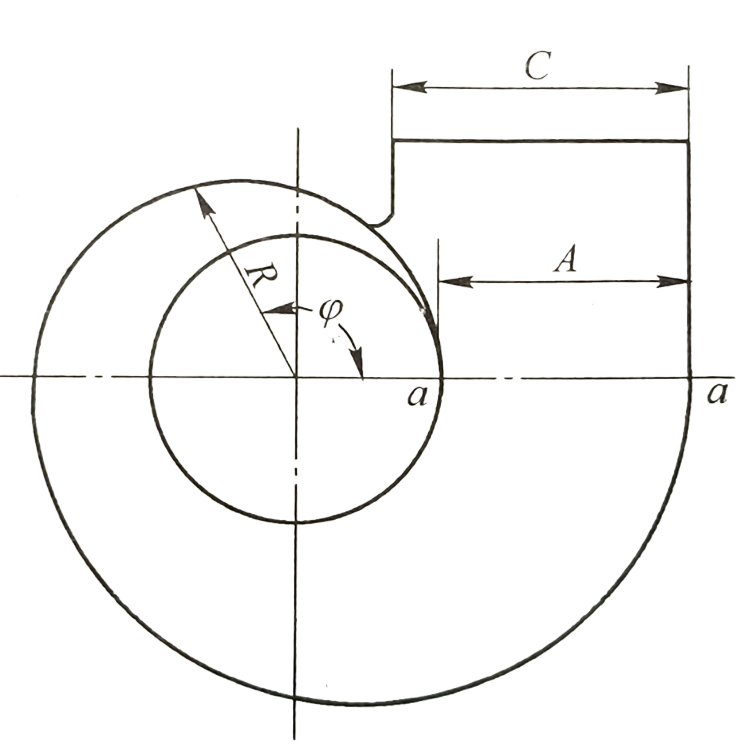 蝸殼的蝸板是一條對(duì)數(shù)螺旋線(如下圖所示)。為了制造方便,一般將蝸殼設(shè)計(jì)制成等寬的矩形斷面。