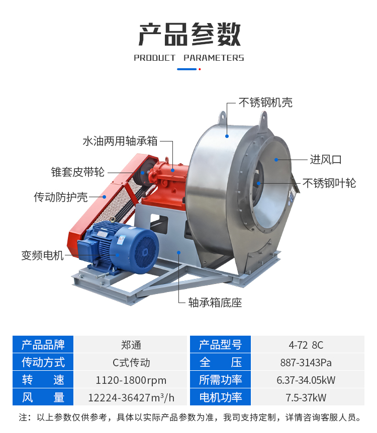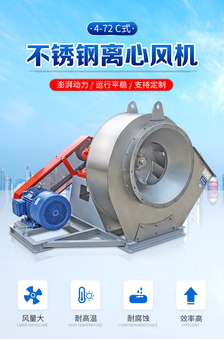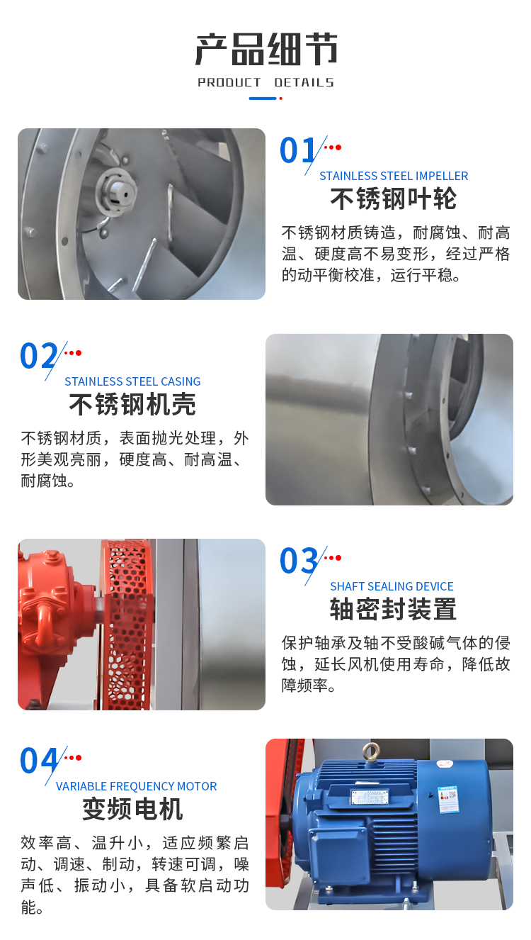外殼及風輪采用不銹鋼風機材質焊接而成,耐高溫,能有效防酸堿、防腐蝕