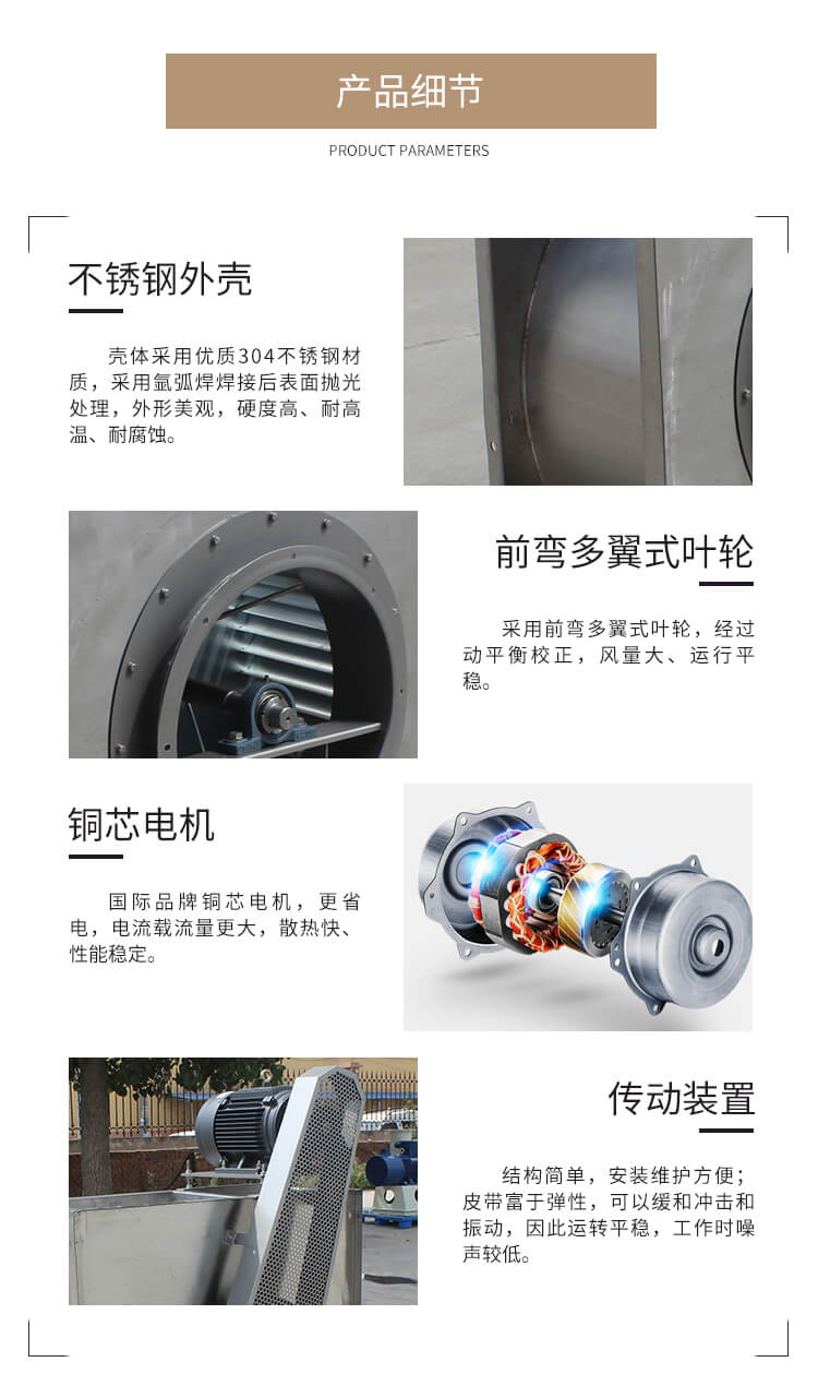 本產品為不銹鋼材質,具有耐腐蝕、強度高、大風量、效率高、安裝方便、經久耐用等優點。前彎多翼風輪,良好的啟動性能;可根據需求定制成電機直聯式或皮帶傳動式,轉速、出風角度均可調節,特殊環境可定制成防爆等級。根據客戶具體參數進行量身定制。非標定制,國標型號均可生產。