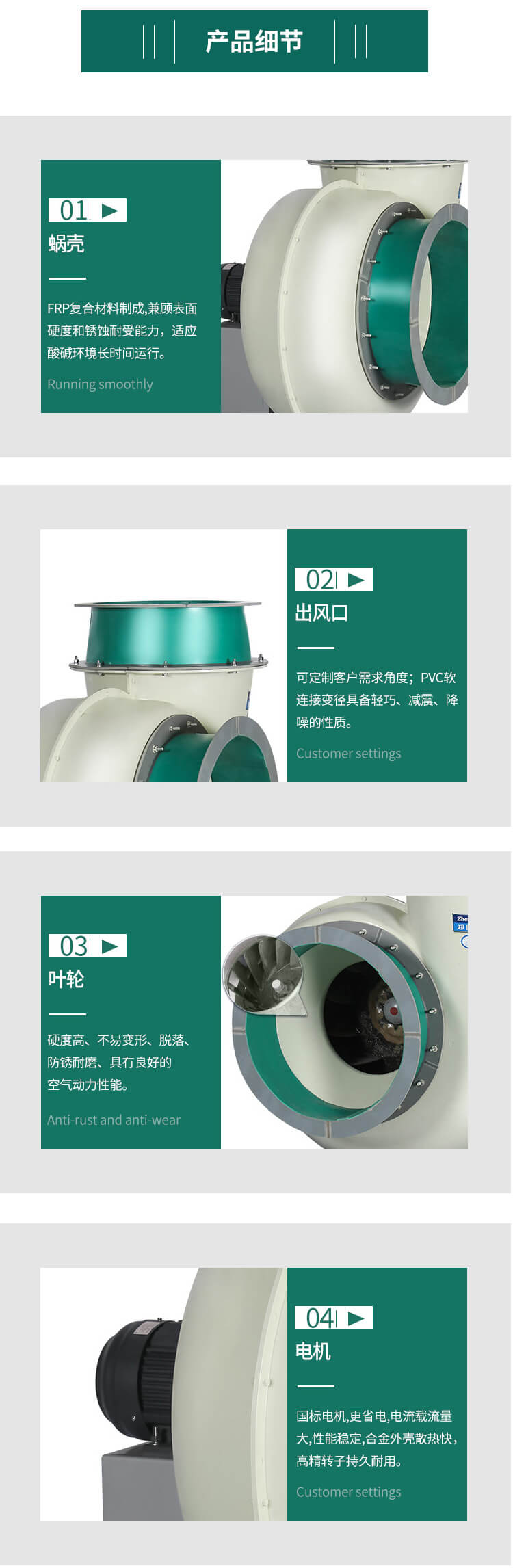 玻璃鋼材質制成,耐腐蝕性好、不易老化、噪聲低、效率高、重量輕。