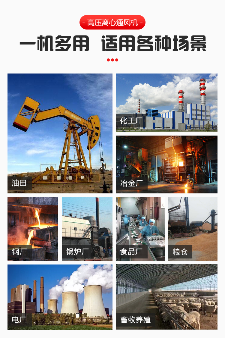 一般用于鍛冶爐、玻璃、陶瓷、電池、無線電等行業(yè)高壓強制送排風,糧食、飼料、礦粉等加工行業(yè)的物料輸送,紙箱機械設備、鋼化玻璃設備等配套使用。