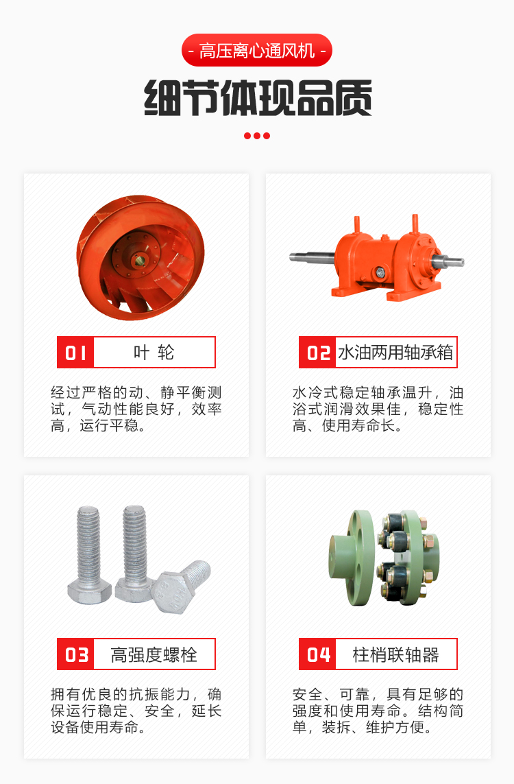 該高壓離心通風機為單吸入式,高壓小流量離心風機。適用于油田、電站、冶金、化工等行業(yè)的高壓強制送風。輸送空氣及無腐蝕性不自燃、不含黏性物質(zhì)的氣體。介質(zhì)溫度一般不超過 50°C(最高不超過80°C),介質(zhì)中所含塵土及硬質(zhì)顆粒不大于150mg/m.動平衡等級符合IS0-1940 G2.5等級,振動值符合ISO-2372 4.5等級要求水準以上。