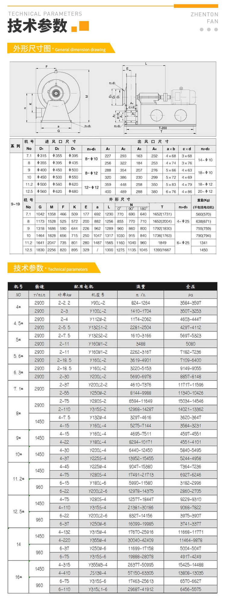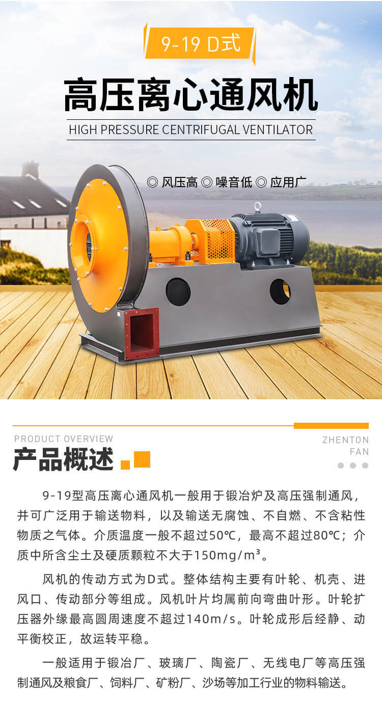 9-19型高壓離心通風機一般用于 鍛冶爐及高壓強制通風, 并可廣泛用于輸送物料,以及輸送無腐蝕、不自燃、不含粘性 物質之氣體。介質溫度一般不超過50°C,最高不超過80°C;介 質中所含塵土及硬質顆粒不大于150mg/m 。