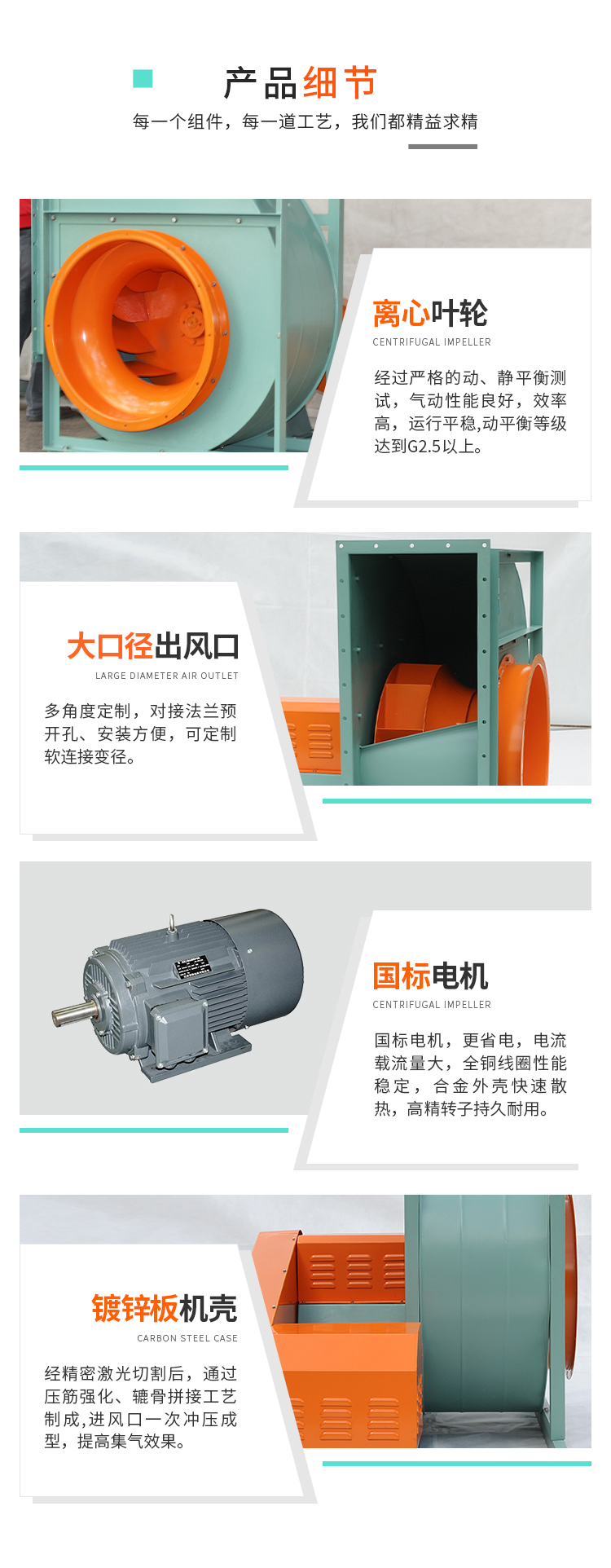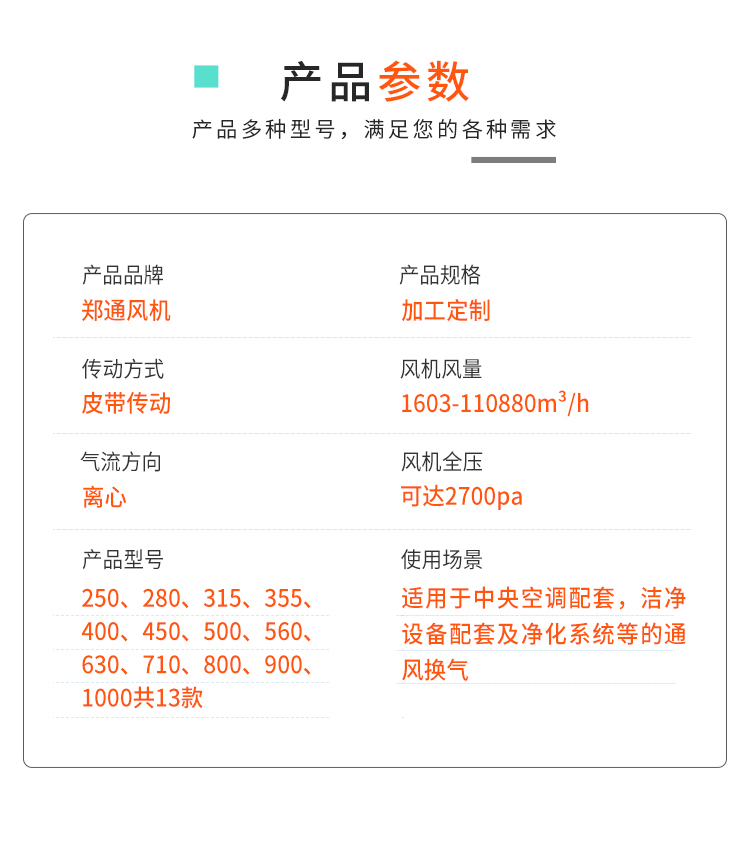 適用于工礦企業,賓館,大型商場等建筑購施的各種大小規格的空調箱,風機柜式空調機組,中央空調機組和各種凈化購備,具有通用性強,效率高,噪聲低,風量大等特點。輸送不自燃,無腐蝕性氣體,氣體含塵量和其他固體含量≤100mg/m3,溫度在-20℃-80℃。 結構