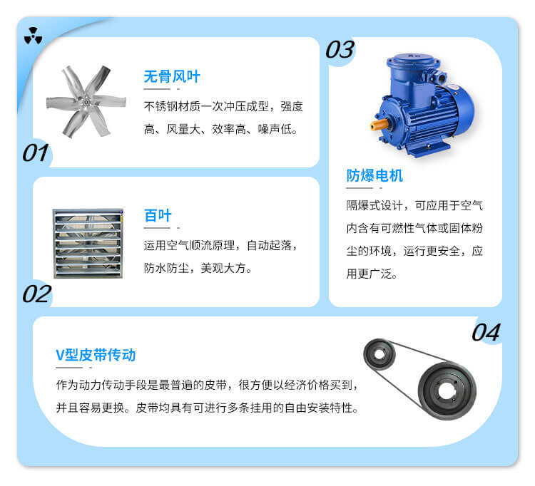 整機采用CAD/CAM設計,具有投資成本低、風量大、噪音低、耗能小、運行平穩、壽命長、效率高等特點,百葉窗自動起閉,防塵、防水、美觀大方;既可吹風,也可抽風,是現代化車間降溫通風的首選,能耗小的負壓風機也是通風降溫設備的市場主流。 負壓式風機是利用空氣對流、負壓換氣的氣壓差原理,由安裝地點的對向大門或窗戶自然吸入新鮮空氣,將室內悶熱氣體迅速強制排出室外,任何通風不良問題均可改善,降溫換氣效果可達90%-97%。具有投資少、耗能低、通風降溫效果顯著等特點。