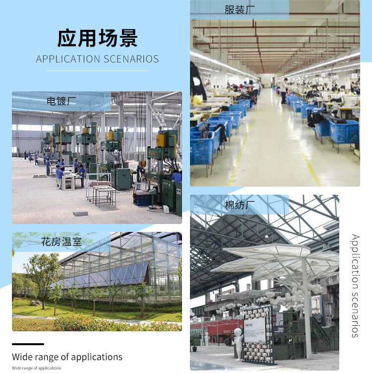 適用于高溫或有異味的車間,勞動密集型企業,園藝溫室大棚、畜牧場、倉儲物流等需要通風降溫或一定濕度的領域,如熱處理廠、皮件廠、電鍍廠、印染廠、車間、網吧、棉紡廠、毛紡廠等。