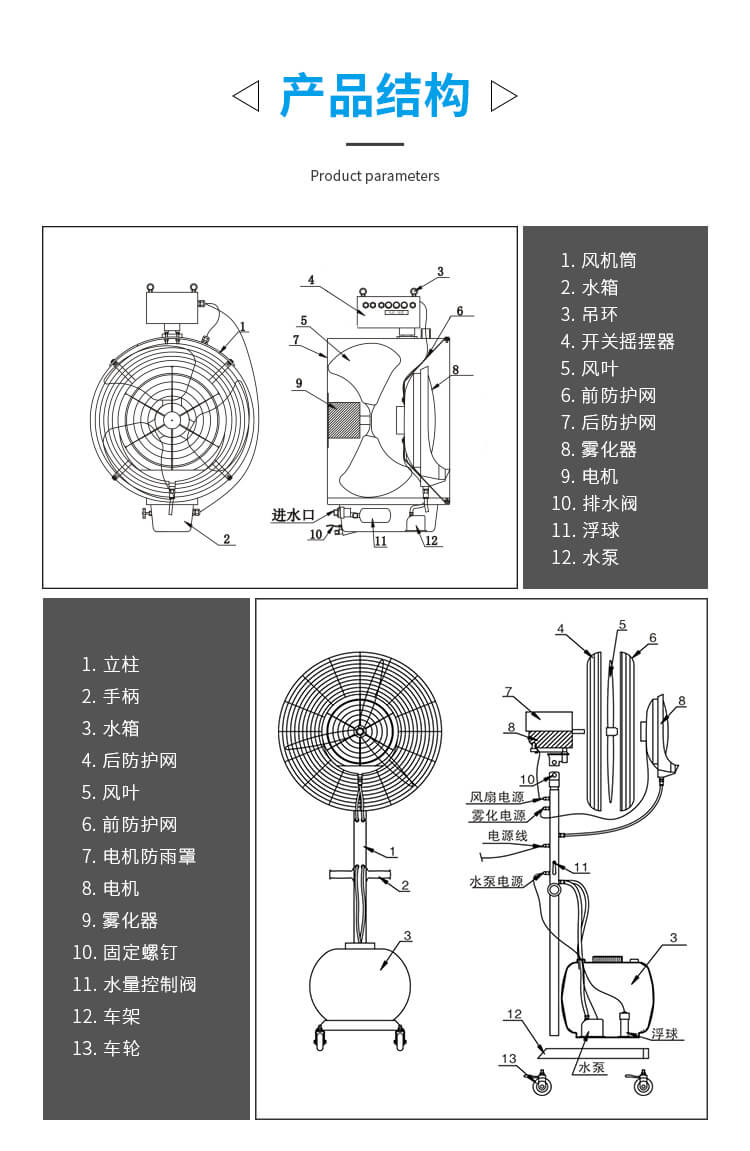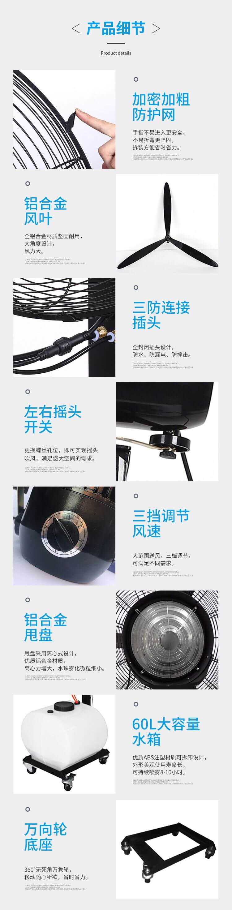 離心式霧化設計,無需噴嘴和水過濾裝置防水電氣設計,使用安全霧化大小可隨意調節、噪音低配有手推車,移動便捷。