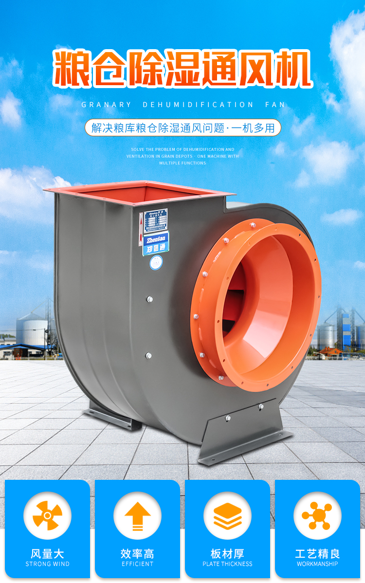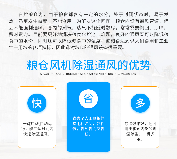 適用于大型糧庫、糧管所倉庫、工廠和建筑物的通風(fēng)、換氣、降溫。
