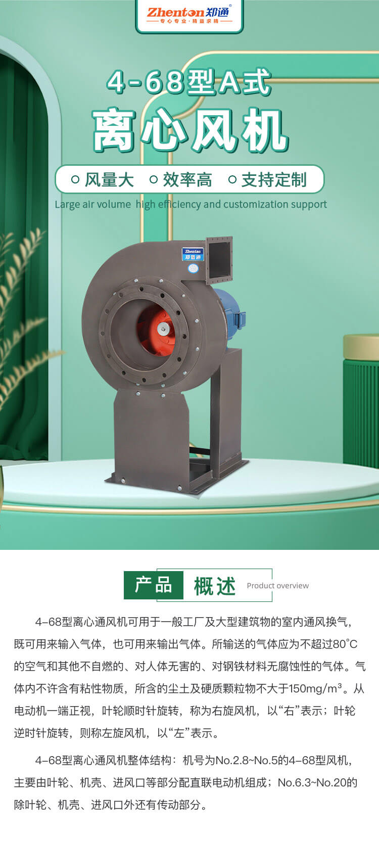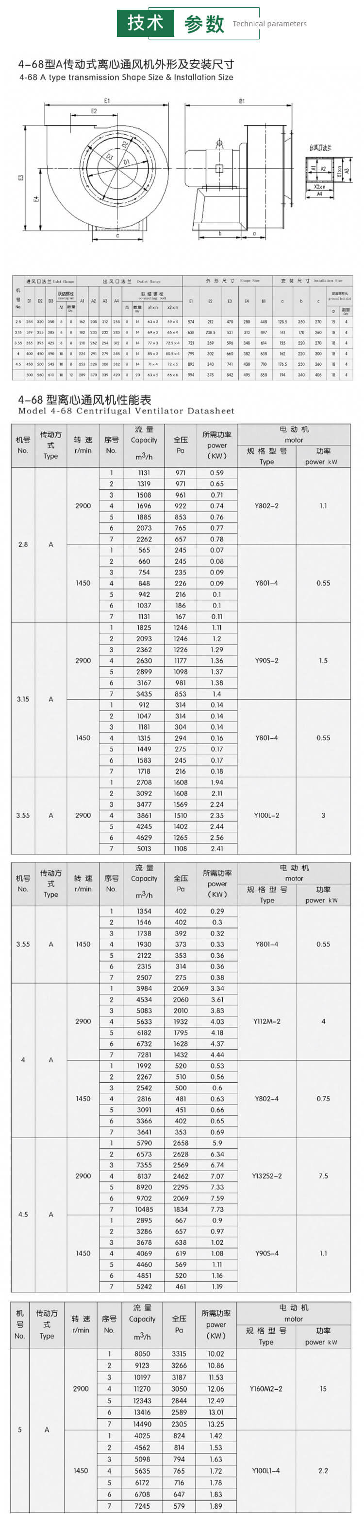 4-68型離心通風機可用于一般工廠及大型建筑物的室內通風換氣,既可用來輸入氣體,也可用來輸出氣體。所輸送的氣體應為不超過80°C的空氣和其他不自燃的、對人體無害的、對鋼鐵材料無腐蝕性的氣體。