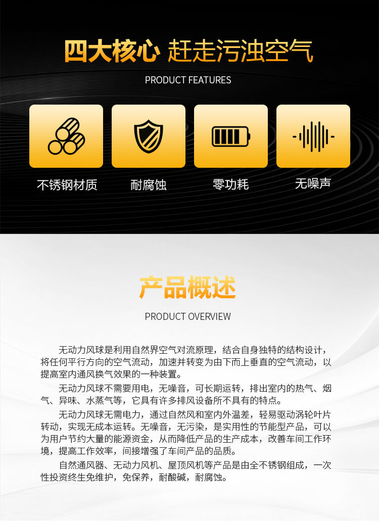 不銹鋼無動力風球是利用自然風力或室內外溫差是指運轉,能將廠房車間內的熱氣、廢氣、油煙、粉塵等有害氣體排出,表面經電化處理,耐氧化,耐腐蝕,使用壽命長,免電力、免維修、無噪聲、堅固耐用,防結露、防雨水。