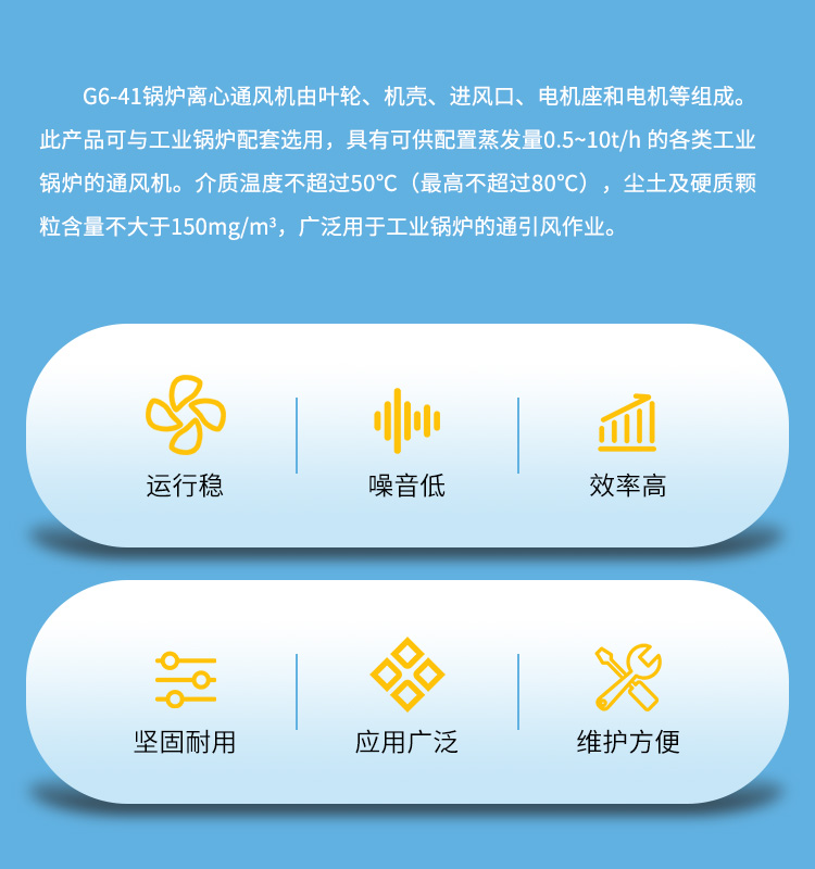 1.適用于燃用各種煤質 并配有消煙除塵裝置的、 蒸發量0.5~ 10t/h的各 類工業鍋爐。 2、高溫烘烤設備的熱風 循環風機。 3、使用環境:氣體介質 中不含腐蝕及易燃易爆 氣體,介質中粉塵及硬 顆粒雜質含量不超過 200mg/m3,長期運行 介質溫度不超過250°C。
