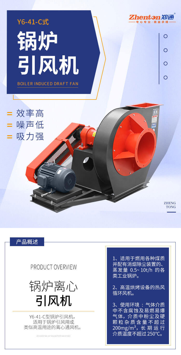 1、適用于燃用各種煤質 并配有消煙除塵裝置的、 蒸發量0.5~ 10t/h的各 類工業鍋爐。 2、高溫烘烤設備的熱風 循環風機。 3、使用環境:氣體介質 中不含腐蝕及易燃易爆 氣體,介質中粉塵及硬 顆粒雜質含量不超過 200mg/m3,長期運行 介質溫度不超過250°C。
