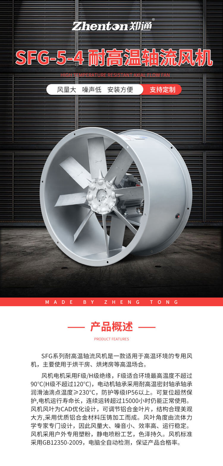 SFG系列耐高溫軸流風機是一款適用于高溫環境的專用風機,主要使用于烘干房、烘烤房等高溫場臺。