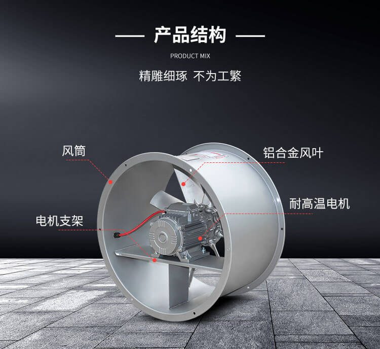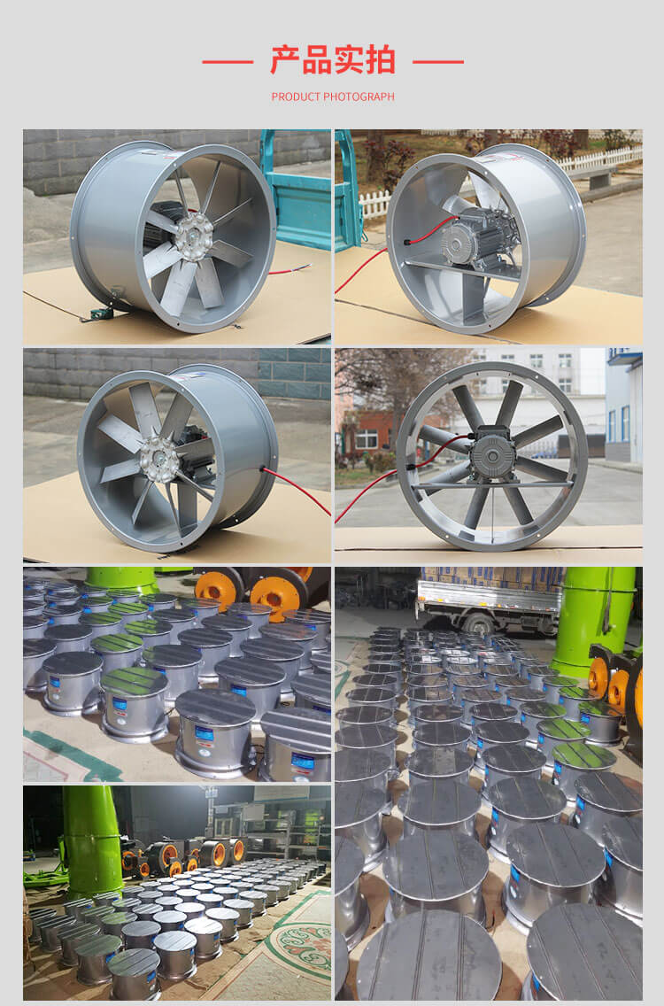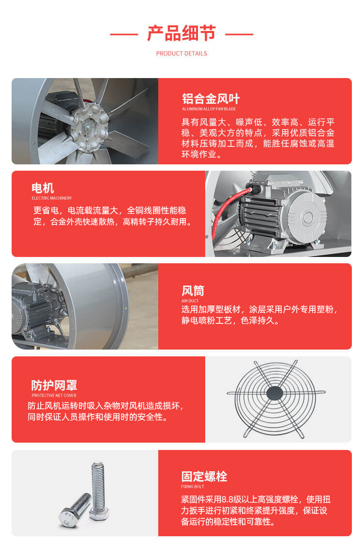 風機電機采用F級/H級絕緣,F級適合環境最高溫度不超過90°C(H級不超過120"C),電動機軸承采用耐高溫密封軸承軸承潤滑油滴點溫度≥230°C,防護等級IP56以上。可復位超然保護,電機運行壽命長,連續運轉超過15000小時仍能正常使用。 風機風葉為CAD優化設計,可調節鋁合金葉片,結構合理美觀大方,采用優質鋁合金材料壓鑄加工而成。風葉角度由流體力學專家專門設計,因此風量大、噪音小、效率高、運行穩定。 風機采用戶外專用塑粉,靜電噴粉工藝,色澤持久。