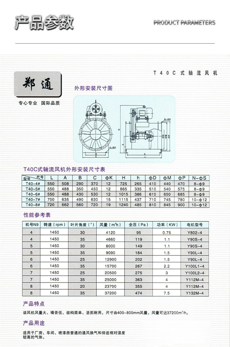 T40C式軸流風機翼型鋁合金壓鑄葉片、性能優(yōu)良、造型美觀,可用于排送相對濕度較大、溫度較高的氣體