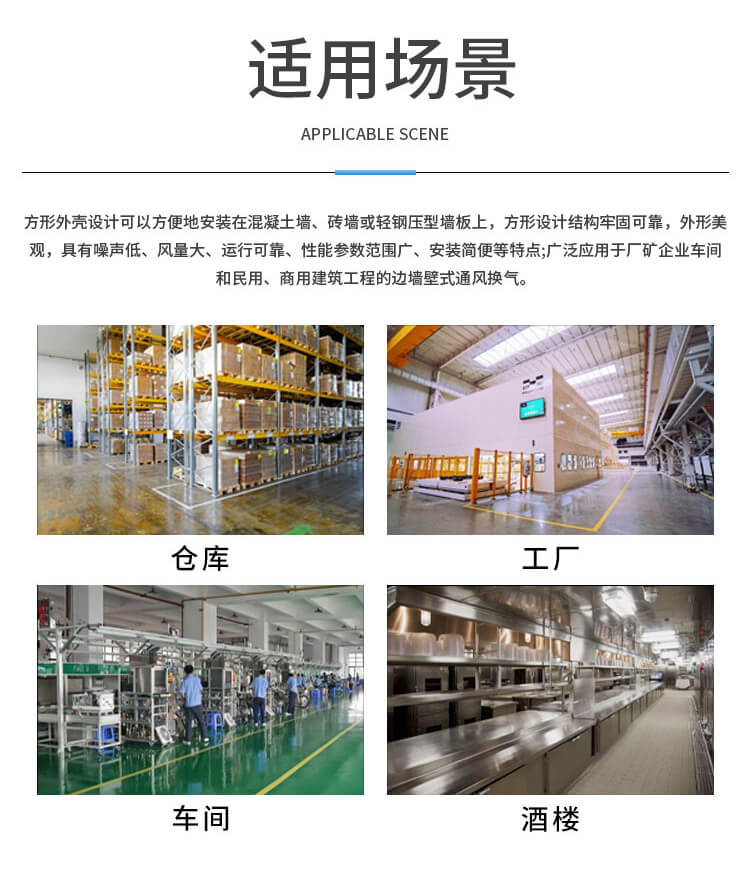 方形壁式軸流風(fēng)機(jī)廣泛應(yīng)用于:石油、軍工、化工、機(jī)械、冶金等行業(yè)的車間、倉庫、辦公室、加油站等場(chǎng)所的降溫通風(fēng)。如需特殊場(chǎng)合需要防爆的,可定制防爆款。