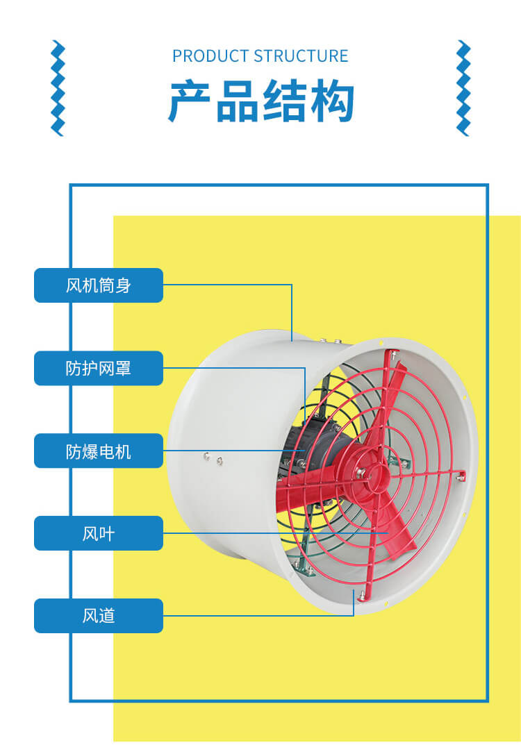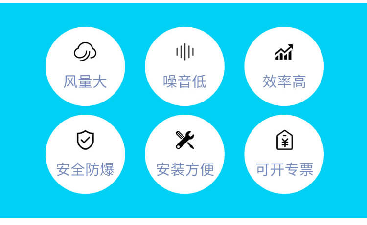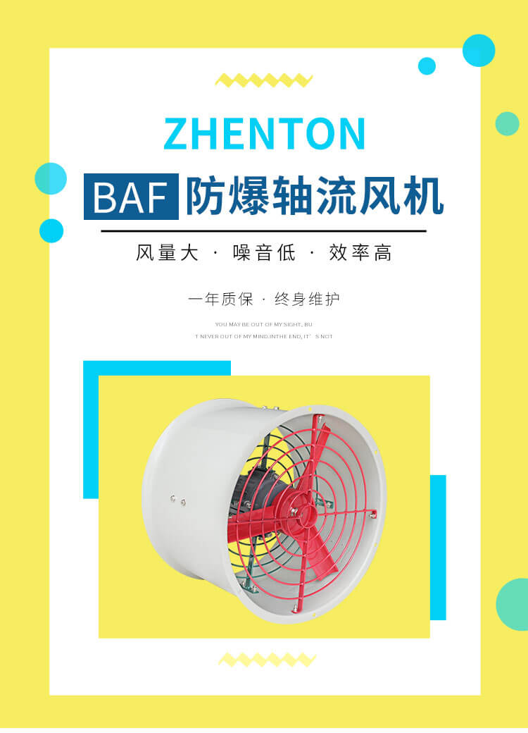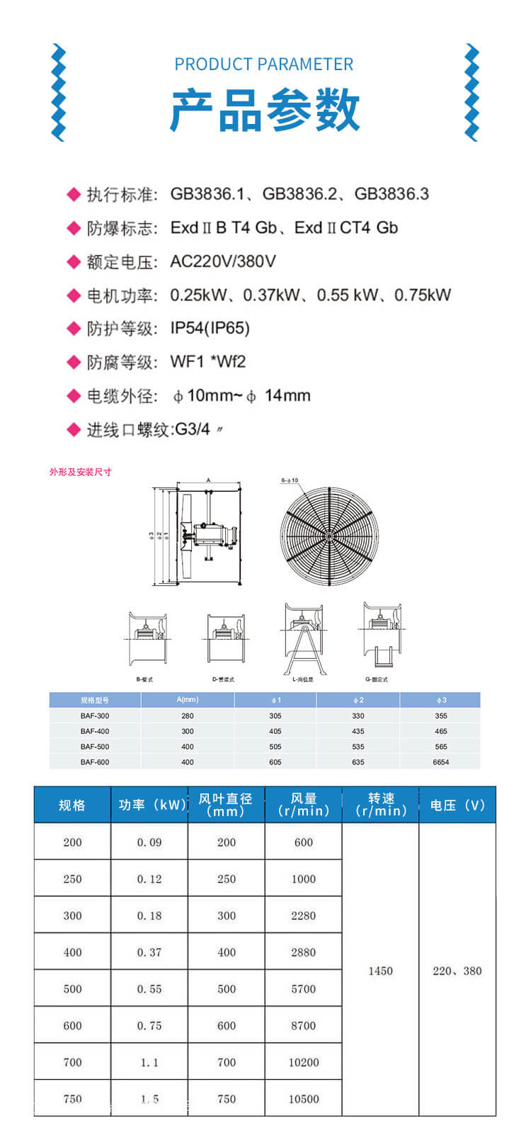 BAF防爆軸流風機適用于ⅡB級T4組及以下級別、組別的爆炸性氣體混合物(1區和2區)場所,作為廠房、倉庫通風換氣或加強暖氣散熱之用
